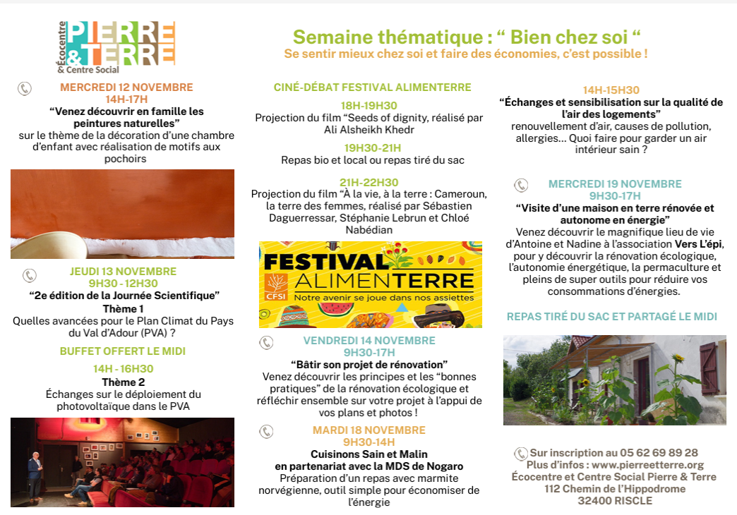 Au cœur de cette semaine, le jeudi 13 novembre, se tiendra la deuxième édition de la Journée Scientifique du Pays du Val d’Adour dans le cadre du suivi de son plan climat, suivie le soir par notre deuxième cycle de ciné-débat Alimenterre (sur le thème des pratiques agricoles sur fond de solidarité internationale).